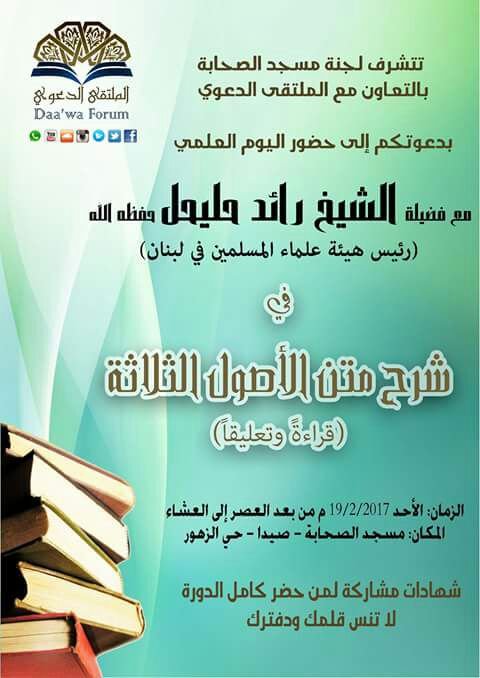 شارك اعضاء اللجنة الدعوية في مجموعة المقدسي اليوم الأحد ١٩-٢-٢٠١٧ في حلقة من حلقات العلوم الشرعية وذلك في مسجد الصحابة في مدينة صيدا حيث نظم الملتقى الدعوي بالتعاون مع لجنة مسجد الصحابة يوم علمي لفضيلة الشيخ رائد حليحل الذي قام بقراءة وشرح “شرح متن الأصول الثلاثة” للشيخ المجدد محمد بن عبدالوهاب رحمه الله حيث بدأ اليوم العلمي من صلاة العصر لغاية صلاة العشاء حضره عدد من المشايخ وطلاب العلم الشرعي .